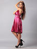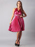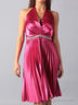 Стильное атласное женское платье с открытой спиной. Лямки-завязки за шеей средней длины, область декольте с V-образным вырезом с запахом, ткань собрана в складки, линия под грудью украшена горизонтальной вставкой из страз в три ряда, юбка плиссированная, на талии сзади тонкие завязки.