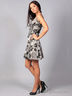 Привлекательное женское платье-сарафан с крупным цветочным принтом. На тонких лямках, расклешенное книзу, лиф украшен под грудью однотонной горизонтальной вставкой с бантом.