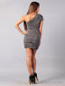 Элегантное женское платье. Левое плечо открыто, короткий правый рукав, все платье в горизонтальную сборку, на правом боку в области талии вставка из треугольника прозрачной ткани.