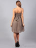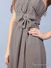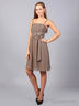 Превосходное женское платье на узких бретелях. Спереди бретели в виде цепочки со вставленными камнями, область груди в узкую вертикальную складку, под грудью горизонтальная полоска и слева на ней вставка из бантика, украшенного стразами, юбка свободная, летящая. Платье с подкладкой, на талии на спине завязки.