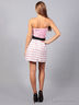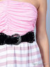 Новомодное женское платье без бретелей. Вшитые чашечки, на спинке резинка, юбка клёш, топ присобран, платье отрезное по линии талии, шлевки под пояс, пояс в комплекте с вставками из кожи, с бляшкой декорированной стразами.