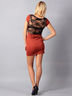 Утонченное женское платье длиной чуть выше колена. Короткий рукав, область спины и область декольте - вставка из черной ажурной ткани, внизу спины бантик из того же материала что и платье.