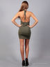 Элегантное женское платье с глубоким вырезом. Вырез с перемычками со стразами, спина открыта, платье облегающее, внизу по бокам сборка.