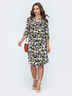 Платье из принтованного софта с фигурным вырезом горловины. Рукав ¾, низ изделия закруглен. Застегивается на пуговицу сзади.