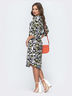 Платье из принтованного софта с фигурным вырезом горловины. Рукав ¾, низ изделия закруглен. Застегивается на пуговицу сзади.
