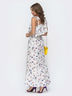 Длинное платье с открытым плечом на завязках. Объемная оборка вдоль выреза. Модель отрезная по талии с вафельной сборкой под бюстом. По низу широкий асимметричный волан.