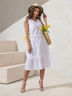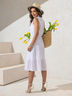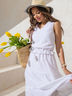 Светлое платье без рукавов из натуральной прошвы. Горловина и подол платья украшены узким кружевом. Отрезная талия на резинке с узкой декоративной оборкой. Изделие на подкладке из хлопковой ткани.
