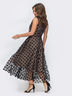Вечернее платье из костюмной ткани с сеткой в крупный горох. Модель отрезная по линии талии, с расклешенной юбкой с мягкими складками. Застегивается на молнию сбоку. Хорошо подойдёт обладательницам типа фигуры "песочные часы" и "груша".