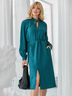 Платье из льняной ткани «жатки» с разрезом спереди. Модель с длинным рукавом-реглан и воротником на декоративных кулисках с завязками. Талия отрезная на кулиске, в боковых швах карманы.