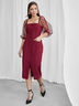 Силуэтое платье из льняной ткани с накладными карманами на юбке. Вырез горловины каре и объемные фатиновые рукава ¾ с резинкой на плече и снизу. Талия отрезная с вшитым поясом. Застегивается на пуговицы по всей длине.
