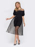 Изящное черное платье из эластичного креп-дайвинга. Изюминка изделия – плиссированная юбка из мягкого фатина. Модель с прозрачной кокеткой и коротким рукавом фонарик. Без застёжек. Прекрасно подойдет для типов фигуры «груша» и «перевёрнутый треугольник».