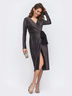 Мерцающее платье длины миди на запах с контрастными лентами, плавно переходящими в бант. Подойдет обладательницам типов фигуры «груша», «песочные часы», «прямоугольник».