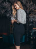 Нарядное платье-футляр из комбинированных тканей. Цельнокроеный верх с рукавом «летучая мышь» выполнен из фактурного трикотажа люрекс. Для удобства сзади на юбке предусмотрен разрез и эластичная деталь на талии. Пояс в комплекте. Прекрасно подойдет для типов фигуры «перевёрнутый треугольник» и «песочные часы».