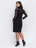Черное платье прямого кроя с воротом хомут . Изделие с полупрозрачным рукавом-реглан длиной ¾. На спинке V-образная вставка из мягкого гипюра. Украшение в комплекте. Прекрасный вариант на каждый день.