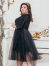 Коктейльное платье из мерцающего люрекса с пышной фатиновой юбкой. Лиф изделия плавно перетекает в декоративный узел на поясе.