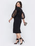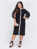 Стильное платье прямого кроя с серебряной планкой на полочке. Изюминка изделия – объемные рукава-фонарики из мягкой сетки в горох. На спинке небольшой вырез с завязками из тесьмы. Для удобства сзади предусмотрены разрез и скрытая застежка-молния.