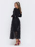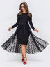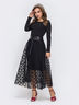 Силуэтное платье-миди из эластичного креп-дайвинга. Модель дополнена съёмной юбкой из фатиновой сетки в крупный горох, пояс изделия из искусственной кожи. Хорошо подойдёт обладательницам типа фигуры "прямоугольник", "песочные часы" и "груша".