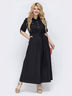 Расклешенное платье отрезное по линии талии. Застёгивается на пуговицы по полочке. Рукав регулируется шлёвкой. По бокам предусмотрены карманы. Пояс из основной ткани в комплекте.