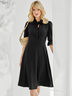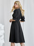 Черное платье с расклешенной юбкой и воротником-аскот. Широкая вставка на талии подчеркивает изящный силуэт. Для комфортной посадки по фигуре на спинке вафельная резинка и скрытая застёжка-молния.