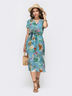 Летнее платье с лифом на запах из принтованного штапеля. Талия присобрана на эластичную тесьму. Для удобства при ходьбе по бокам предусмотрены разрезы. Комплектуется поясом из основной ткани.