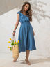 Однотонное платье из жатой льняной ткани. Модель приталенного кроя с расклешенной юбкой и вафельной сборкой на поясе. Лиф декорирован кокетливыми завязками. Запах зафиксирован.