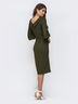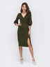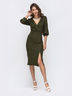 Элегантное платье из фактурного жаккарда с напылением. Модель облегающего силуэта, с глубоким вырезом декольте и шалевым воротником. Широкие рукава длиной ¾ собраны на манжете. Юбка с диагональной прострочкой и высоким вырезом спереди. Подойдет обладателям типов фигуры «прямоугольник», «песочные часы» и «груша».