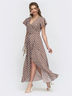 Длинное платье на запах в актуальный гороховый принт. Модель отрезная по талии с воланами на рукавах.