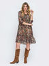 Расклешенное платье из легкого принтованного шифона. Горловина регулируется завязками. В изделии предусмотрена подкладка.