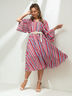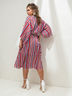 Отрезное по линии талии платье с эластичной тесьмой в поясе. Изделие со спущенным рукавом ¾ и V-образным вырезом с вертикальными декоративными планками до талии. В изделии предусмотрена подкладка. Пояс в комплект не входит.