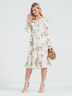 Летящее платье в нежный цветочный принт с оборками. Талия и горловина выполнены резинкой. На полочке изделие декорировано рядом пуговиц.