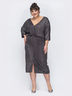 Сияющее платье из тонкого трикотажа с радужным напылением. Изделие отрезное по талии с рукавом «летучая мышь». Глубокий V-образный вырез подчеркнет изящное декольте. Спереди предусмотрен разрез.