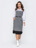 Офисное платье, выполненное имитацией сарафана, надетого поверх рубашки. Верх – из хлопка с отложным воротником. Полочка дополнена прорезными карманами. Подол юбки выполнен контрастной вставкой из креп-дайвинга. Пояс в комплекте. Изделие подойдет обладательницам типов фигуры «груша», «песочные часы», «прямоугольник».