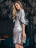 Вечернее платье приталенного силуэта из велюра. Модель с V-образным вырезом акцентирует внимание на зоне декольте. Объёмный рукав присобран на манжете. Подойдёт для типа фигуры «песочные часы» и «прямоугольник».