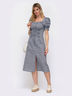 Льняное платье с короткими рукавами-фонариками и высоким разрезом спереди. Вырез каре присобран на эластичную тесьму с рюшей. Шнуровка выгодно подчеркивает приталенный силуэт и приподнимает грудь.