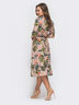 Платье из софта с тропическим принтом. Модель с воротником «аскот» и эластичным поясом, дополнена воланами по подолу юбки и на рукавах.