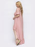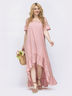 Струящееся платье со шлейфом. Кокетка и рукава изделия выполнены со вставками из сетки с флоковым напылением в «горошек». Подол изделия дополнен воланом.