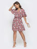 Струящееся платье из софта пыльно-розового цвета с цветочным рисунком. V-образный вырез, фиксированный запах на груди, короткий расклешённый рукав. В поясе предусмотрена эластичная деталь.