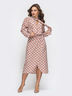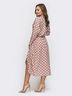 Платье из струящегося софта в горох. Изделие с лифом на запах и эластичной деталью в поясе. Горловина переходит в завязки, из которых можно завязать бант. На модели представлен 44 размер: длина по спинке – 122 см; длина рукава (от горловины) – 68 см;