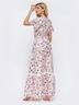 Нежное платье-макси в мелкий цветочный принт. Глубокий треугольный вырез с декоративными завязками, переходящими в бант. В поясе предусмотрена эластичная деталь. Снизу изделие дополнено широкой оборкой с кружевной окантовкой.