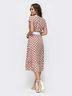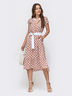 Летящее платье в ретро стиле из софта в горох дополнено широкой оборкой по низу. Модель с расклешенной юбкой, слегка удлиненной по спинке. В поясе предусмотрена эластичная деталь. Завершает образ контрастный тканевый пояс в комплекте.