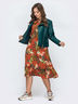 Платье из софта с тропическим принтом. Модель с воротником «аскот» и эластичным поясом, дополнена воланами по подолу юбки и на рукавах.