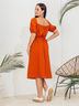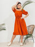 Яркое расклешенное платье с эластичной деталью по горловине и манжетах. Талия выполнена кулиской.
