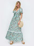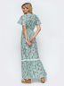 Нежное платье-макси в мелкий цветочный принт. Глубокий треугольный вырез с декоративными завязками, переходящими в бант. В поясе предусмотрена эластичная деталь. Снизу изделие дополнено широкой оборкой с кружевной окантовкой.