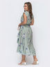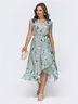 Платье из воздушного софта с цветочным принтом. Изделие отрезное по талии с эластичной деталью в поясе. Расклешенная юбка с запахом, дополнена воланом. Тканевый пояс в комплекте.