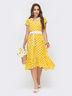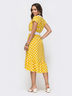 Летящее платье в ретро стиле из софта в горох дополнено широкой оборкой по низу. Модель с расклешенной юбкой, слегка удлиненной по спинке. В поясе предусмотрена эластичная деталь. Завершает образ контрастный тканевый пояс в комплекте.