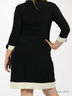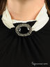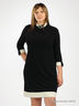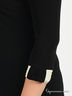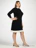 Трикотажное платье прямого покроя из приятного на ощупь, лоснящегося материала. Воротник стойка украшен брошью. Рукава 3/4 с манжетами в складку. На спинке молния.