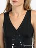 Яркое и сексуальное платье из эластичного, нежного на ощупь материала. V-образный вырез спереди и на спинке. Приталенный силуэт прекрасно подчеркивает фигуру. Декорировано крупными прозрачными пайетками.