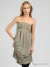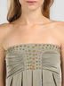 Шикарное платье без бретелек. Выполнено из эластичного, шелковистого материала элегантно переливающегося на свету. Отрезной лиф присборен и декорирован золотыми клепками. По внутренней стороне лифа вшита силиконовая полоска для лучшего крепления. Спинка лифа посажена на многорядную резинку.