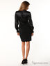 Комбинированное платье-футляр с длинными рукавами, в конце на резинке и маленьким воланом. С V-образным вырезом, который оторочен пересекающимися лентами накрест. По линии плеч и на отрезе над юбкой - на защипах. С широким поясом и молнией сбоку.
