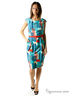 Трикотажное платье- футляр с короткими рукавами, плотными подплечниками, отрезной линией талии и накладными карманами, декорировано контрастным геометрическим принтом, выточками и функциональным текстильным поясом. Сзади на молнии.